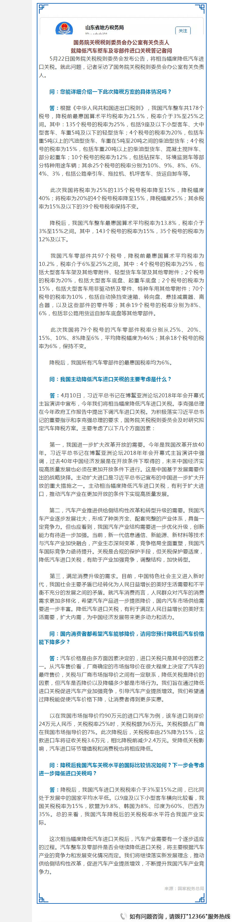 降低汽车整车及零部件进口关税答问 发布20180523-03
