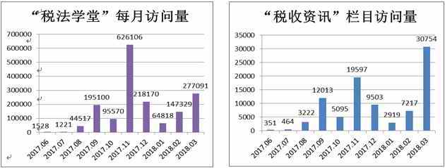 “税法学堂”总访问量及“税收资讯”栏目访问量 各地税务机关创作的内容丰富、形式多样的漫画、微电影、公益广告等作品在“税法趣味角”、“税法在课堂”栏目集中展示,琳琅满目的资源“超市”可以满足各个年龄段青少年的学习需求,为各地开展青少年税法宣传活动提供了资源库。 “税法学堂”的设立也激励了大朋友、小朋友们进行创作。从史料中找故事、用彩笔画税收,这些本来只是与同事、同学小范围内分享的兴趣爱好,搭乘“税法学堂”这趟宣传快车就能进入全国青少年的视线,进一步激发了税务干部和小朋友们的创作热情。黑龙江省税务部门一位税务干部自己整理创作出40集税收故事;福建省税务部门上传的小朋友们创作的优秀漫画《税收在我心中》《小税收•大作用》《润泽》被频频浏览;山东省税务部门围绕一枚粘贴在老收音机后档板上的货物税税票,讲述了建国初期运用照证制度管理税收的故事,点击量破千;陕西省税务部门根据白居易的诗词《征秋税毕题郡南亭》,图文并茂地分析讲解,引来近千名小朋友们的关注和其他平台转载。
